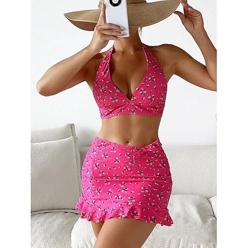 Damen Bikini 3-Teilig Badeanzug mit Rock Rock Slim Rückenfrei Urlaubs Strandbekleidung Floral Halterneck Ärmellos Bademode