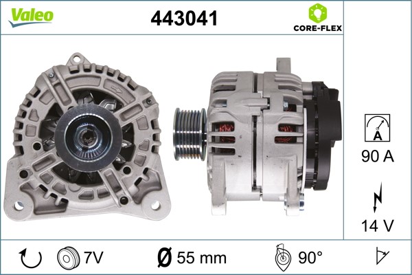 Laturi 14V 90A Valeo Valeo core-flex 443041 - renault - OE 7711497091, 8200406270, 8200429898