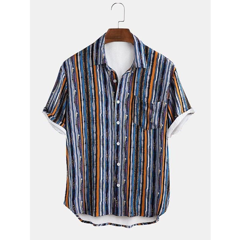 Men's Stripes Button Up Shirt Short Sleeve Vintage Hawaiian Dailywear Causal Casual Summer Spring Collared Shirts Pocket 3D Print Yellow Blue Green
