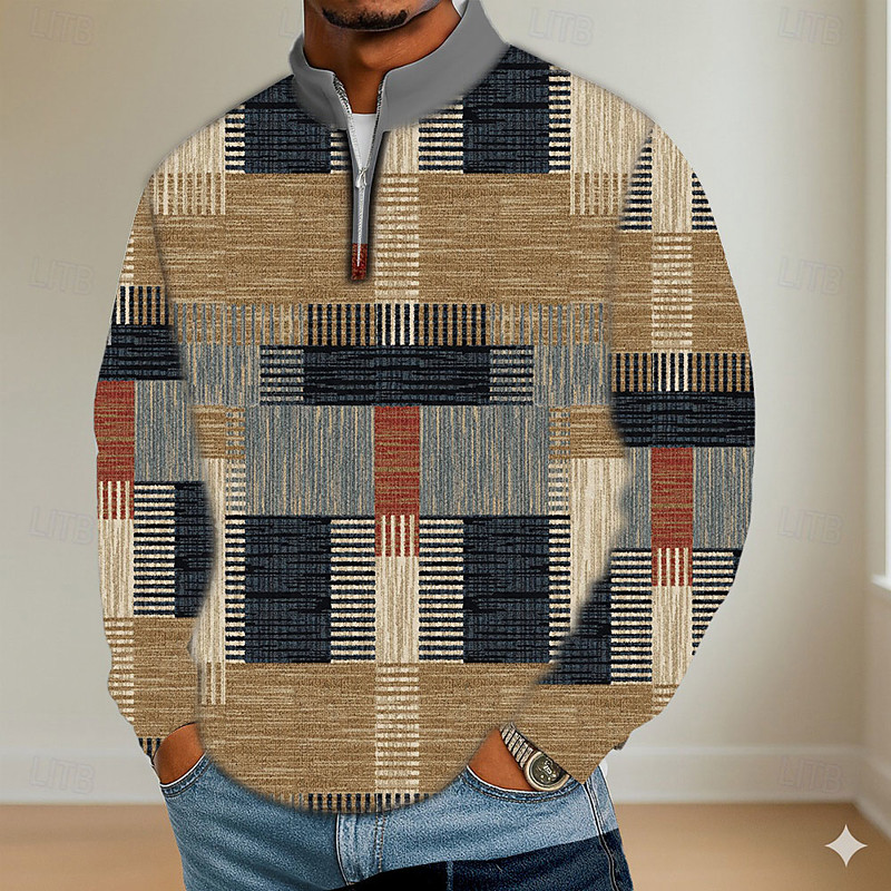 Men's Color Block Geometic Polo Long Sleeve Standing Collar Athleisure Vacation Athleisure Casual Daily 3D Print Spring Fall Blue Purple Brown