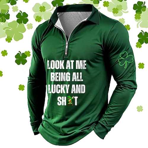 San Patrizio Per uomo Quadrifoglio Polo con zip Manica Lunga Magliette polo Camicie con Colletto Casual All'aperto Streetwear Athleisure Abito da festa Stampa 3D Primavera Autunno Nero Verde Blu