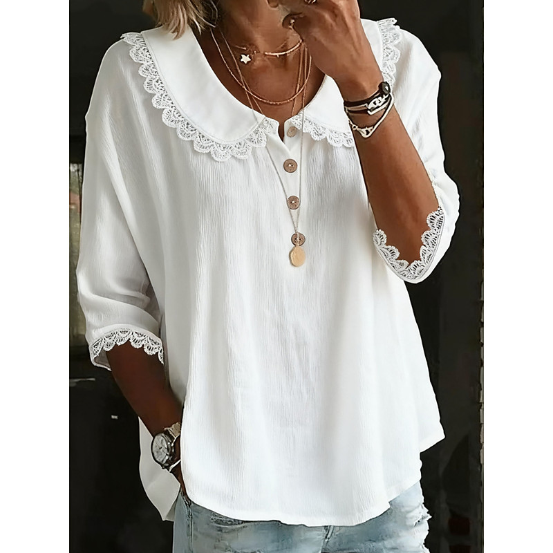 Women's Blouse Solid Color Stylish Casual 3/4 Length Sleeve Shirt Collar Regular Tops Daily Lace Trim Blue White Yellow Pink Summer Spring Fall
