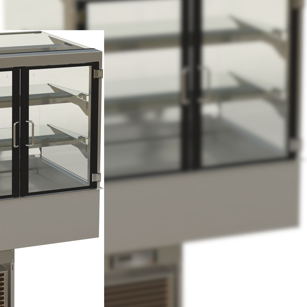 Showcase "Kopenhagen" eckig, für 2 Kuchenbleche, 3 Auslagen. Maße: 920x710/265+410x792mm (BxHxT) Steckerfertig mit Transporthandgriff
