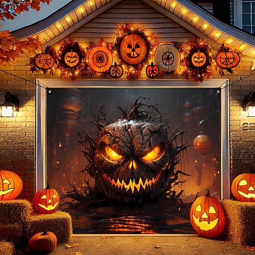 Halloween arazzo Copertura per porta del garage Grande appeso Zucca 3D Gotico punk oscuro Da serata All'aperto Sfondi di ripresa Yarda Casa infestata Arredamento per la casa