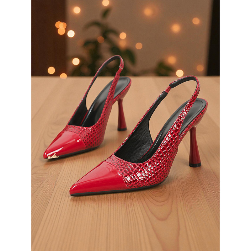 Women's Red Patent Croc-Embossed Slingback Heels - Pointed Toe Block Pumps for Christmas Party, Holiday Dinner or Elegant Festive Outfits