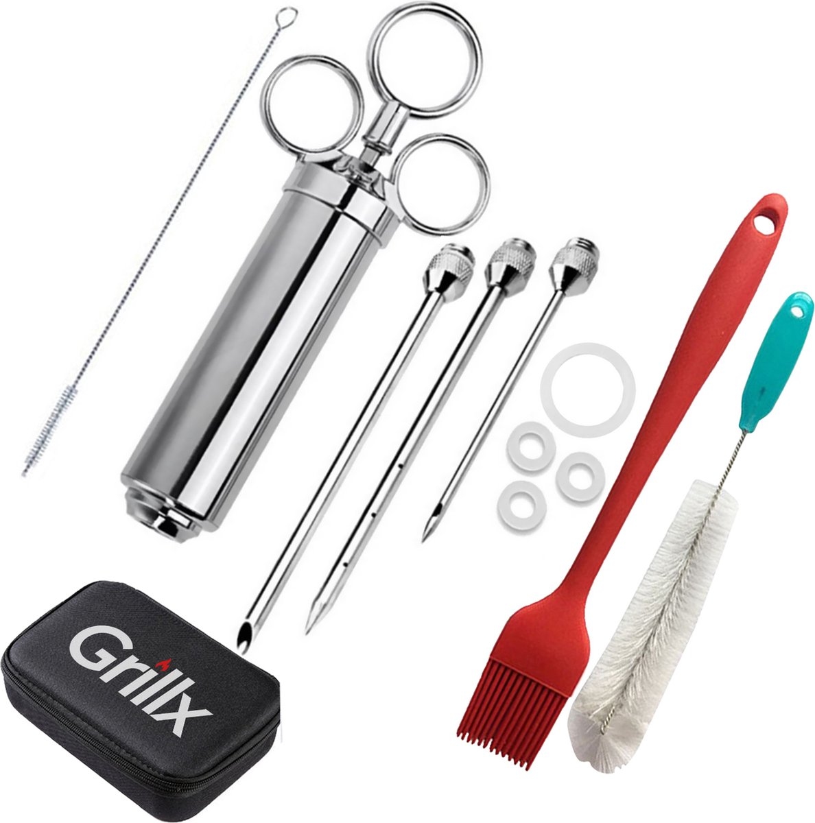 GrillX Deluxe Marinade Injection Sprayer inklusive 3 Nadeln, Bürsten und Aufbewahrungskoffer.
