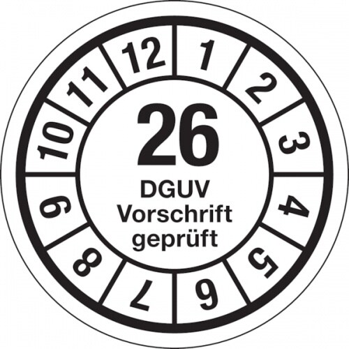 König Werbeanlagen Jahresprüfplaketten ab 26, DGUV Vorschrift geprüft, Jahresfarben, Ø 35mm - Bogen = 10 Plaketten - 35 mm Folie selbstklebend