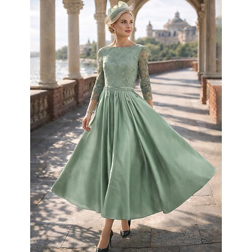 Linea ad A Lunghezza alla caviglia Vestito da Festa Abito da Cocktail Abito da invitata a nozze Abito da cerimonia per signora Manica 3/4 Collo gioiello Elegante Ospite di nozze Chiffon Pizzo con