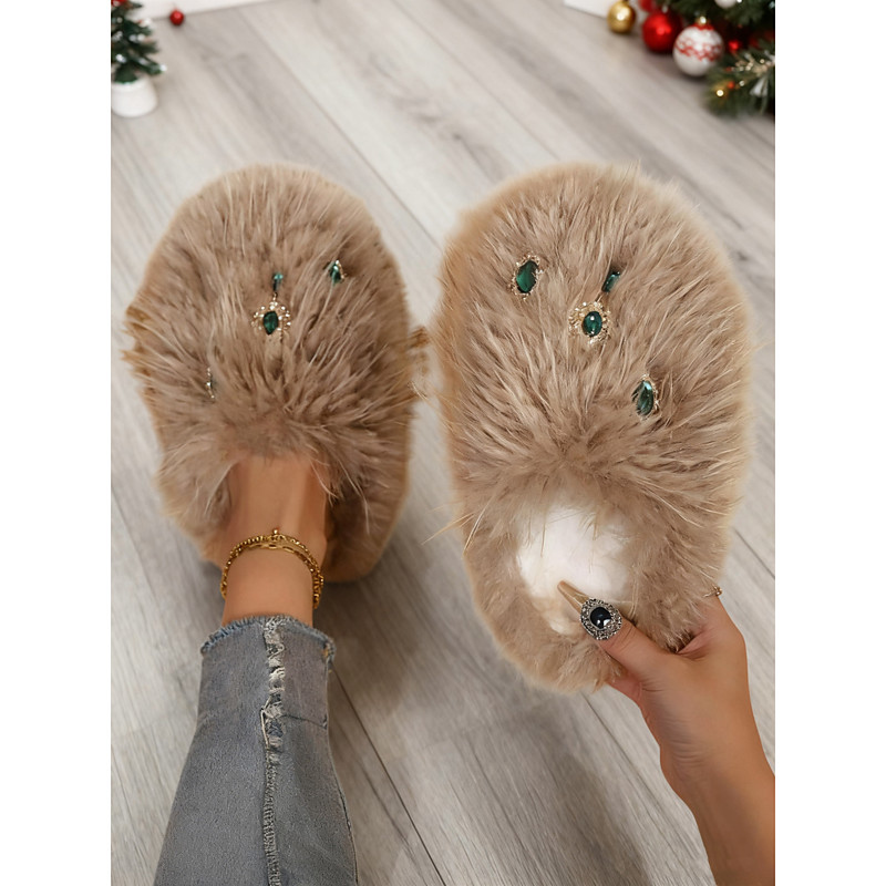 Women's Fuzzy Fur Slippers with Gem Embellishments – Warm Cozy Indoor Winter Home Shoes for Ladies, Soft Plush Christmas Holiday Gift