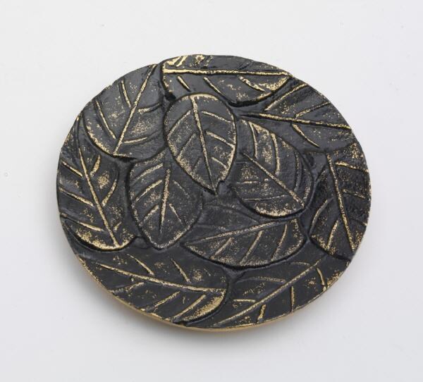 Kerzenteller, Dekoteller aus Alu in Blätterstruktur schwarz/gold, Ø 12 cm