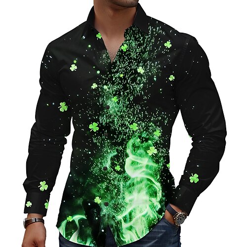 Camicia Neon Glow Shamrock Fiamma per Uomo di San Patrizio Camicia Button Up a Maniche Lunghe Vintage Retro Festa Vacanza Primavera Autunno Turndown Camicie Colletto Stampa 3D Nero 1 Nero