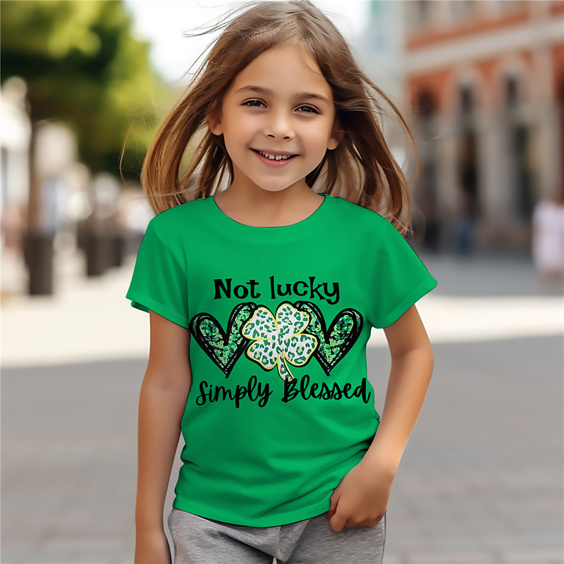 St. Patrick Girls' 3D Four Leaf Clover Tee Shirts Short Sleeve 3D Print Summer Active Fashion Cute Polyester Kids 3-12 Years Crew Neck Outdoor Casual Daily Regular Fit
