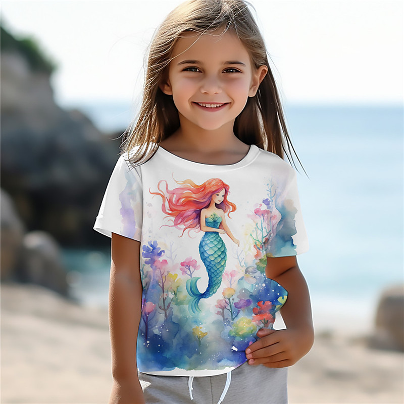 Girls' 3D Mermaid Tee Shirts Short Sleeve 3D Print Summer Active Fashion Cute Kids 3-12 Years Crew Neck Outdoor Casual Daily Regular Fit