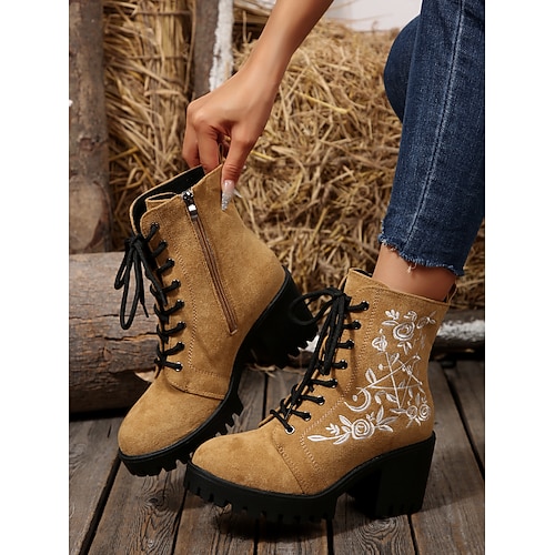 stivaletti da donna in pelle scamosciata color cuoio con lacci e ricami floreali, stivali da combattimento con tacco a blocco per abbigliamento casual e da festa