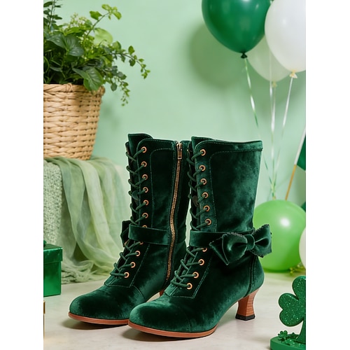 stivali stringati in velluto verde bosco da donna: eleganti stivaletti con tacco a gattino e fiocco per eventi di San Patrizio e festival invernali