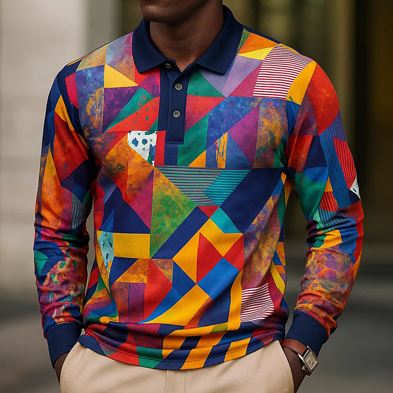 Men's Abstract Geometic Polo Long Sleeve Polo Shirts Lapel Business Casual Athleisure Daily Wear 3D Print Buttons Spring Fall Winter Red Rainbow