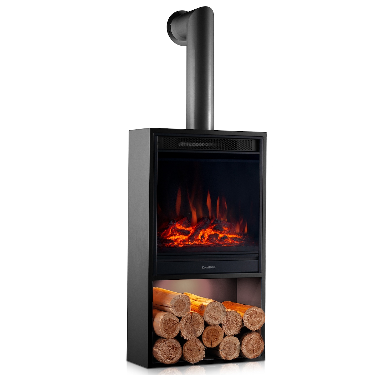 KAMINIO Elektrokamin HUGO mit Ofenrohr - Elektrischer Kaminofen mit Heizung, 3D-Flammeneffekt, LED-Ambientelicht, Holzfach, Fernbedienung - Schwarz