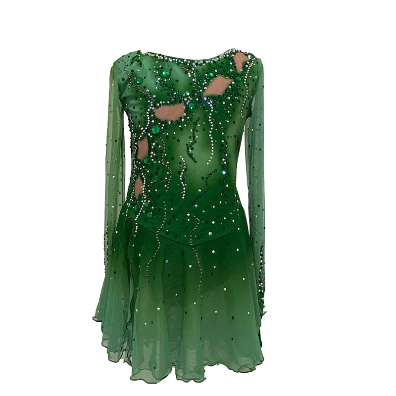 Figure Skating Dress Women's Girls' Ice Skating Dress Green Patchwork Open Back Spandex Mesh High Elasticity Training Competition Skating Wear Classic Crystal / Rhinestone Long Sleeve Ice Skating