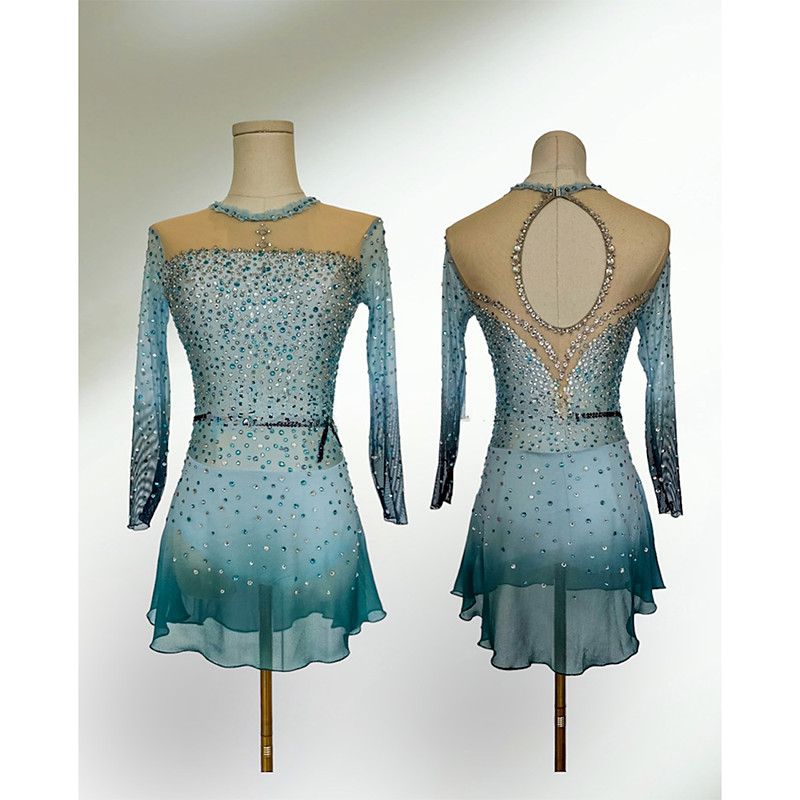 Figure Skating Dress Women's Girls' Ice Skating Dress Sky Blue White Patchwork Open Back Mesh High Elasticity Training Competition Skating Wear Classic Crystal / Rhinestone Long Sleeve Ice Skating