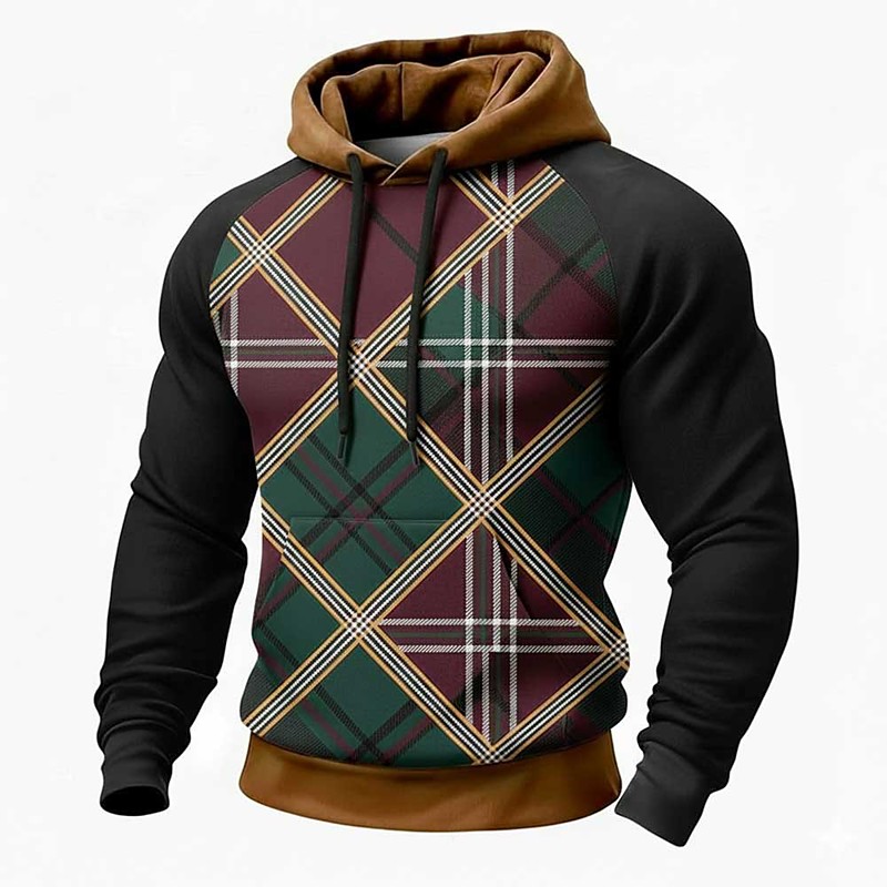Men's Geometric Plaid Hoodie Sweatshirt Fashion Daily Crew Neck Home Streetwear Party Blue Red Brown Green Drawstring Fall Winter Designer S M L XL XXL XXL