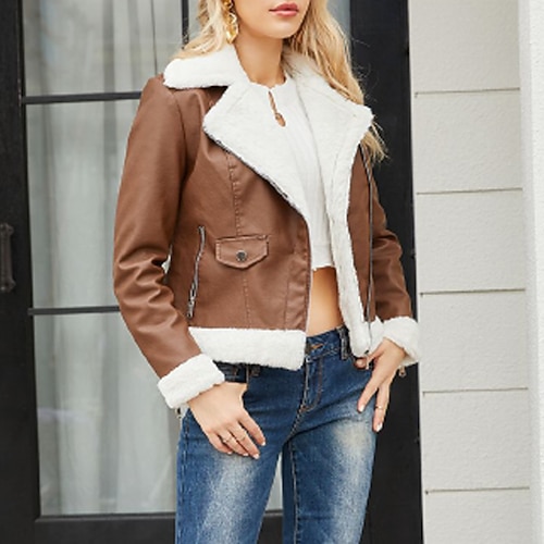 Per donna Giacca in Ecopelle Giacche di pelle di pelliccia Caldo Confortevole Cerniera Tasca Casual Semplice All'aperto Vacanza Uscire Weekend Regolare Collo ripiegato Vestibilità regolare Manica