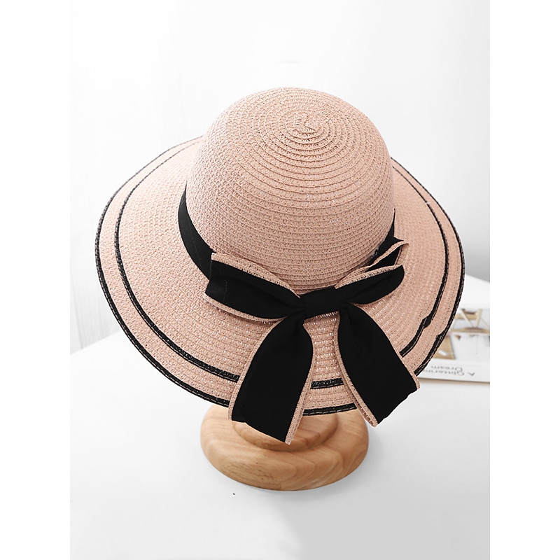 Women's Bow Straw Hat - Foldable for easy carrying, Stylish sun hat with black ribbon details, Perfect for the beach, Vacation and summer outdoor activities