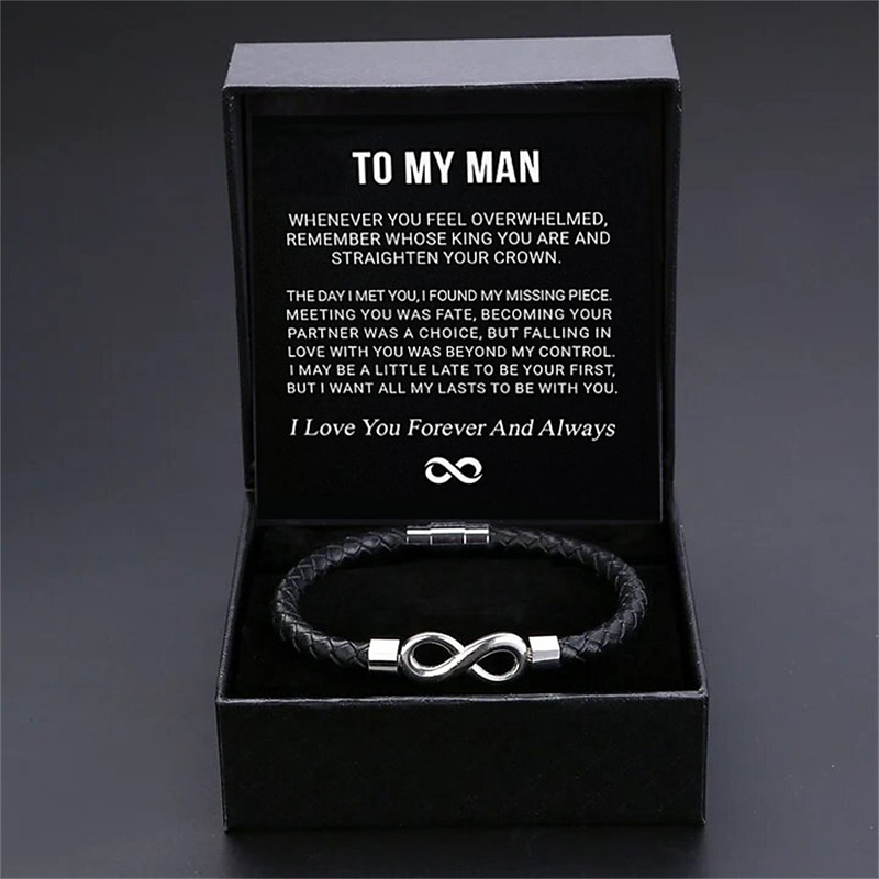 To My Man Infinity Bracelet, Magnetic Clasp Leather Bracelet for Him, Stainless Steel Men's Braided Rope Bracelet with Flip Lid Gift Box, Christmas, Birthday, Anniversary Gift for Boyfriend or Husband