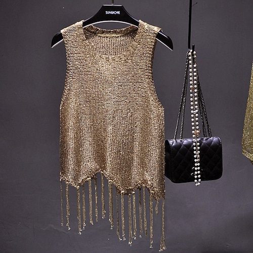 Per donna Blusa Top traforato Canotta a canotta Semplice Elegante Sexy Casual Senza Maniche Girocollo Top Regolari Quotidiano Ferie Uscire Traforato Glitter Nero Cachi Albicocca Estate Primavera