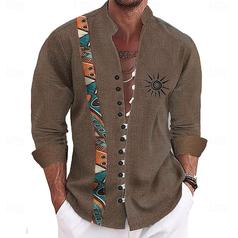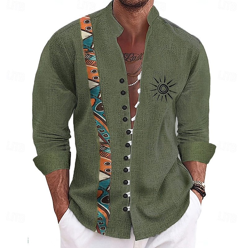 Men's Sun Ethnic Indian Culture Shirt Stand Collar Shirt Long Sleeve Vintage Retro Vacation Daily Wear Going out Spring Fall Mandarin Collar Band Collar Button-Down Linen Like Shirt Blue Dark Green