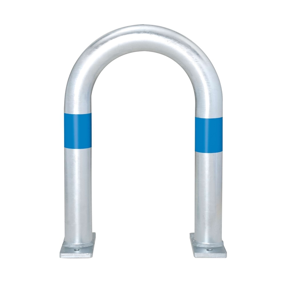 PROREGAL Reflektierender Stahlschutzbügel CITY mit blauen Streifen | Ladesäulen-Schutz zum Aufdübeln | HxBxT 50x36x16cm | Rohr-Ø 6cm | Silber/Blau