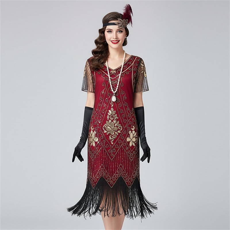 Retro Vintage Roaring 20s 1920s Knee Length Flapper Dress Dress Outfits Short Sleeves The Great Gatsby Wedding Guest Sequins Tassel Fringe V Neck Fancy Dress Women's Christmas Carnival Masquerade