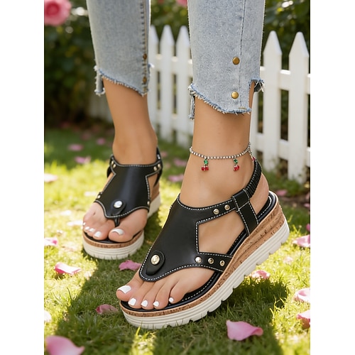 sandali con zeppa in sughero nero da donna – comode scarpe aperte slip-on con dettagli di rivetti per l'estate casual e l'abbigliamento outdoor