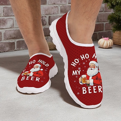 Weihnachtsschuhe für Herren mit Weihnachtsmann-Bier-Motiv – lustige, atmungsaktive Slip-on-Sneaker mit dem Aufdruck „Ho ho, halt mal mein Bier", lässige Festtagsschuhe für Partys und als Geschenk