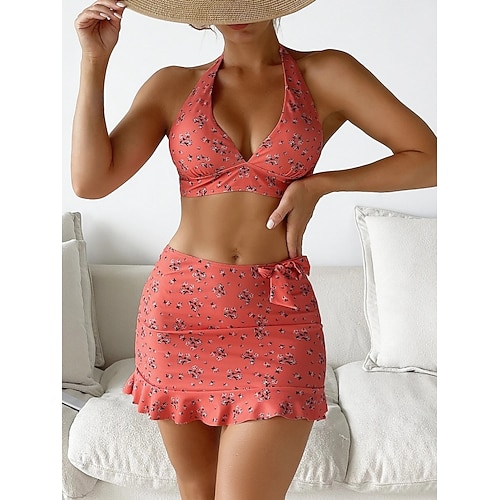 Damen Bikini 3-Teilig Badeanzug mit Rock Rock Slim Rückenfrei Urlaubs Strandbekleidung Floral Halterneck Ärmellos Bademode