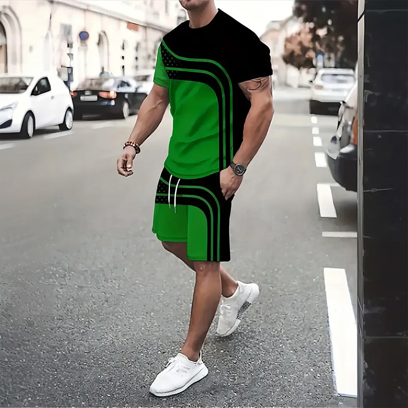 Men's Striped 2pcs Tees sets Summer Tops Short Sleeve Short Pants Crew Neck Sport Casual Outdoor Vacation Sport 3D Print Summer Black Green