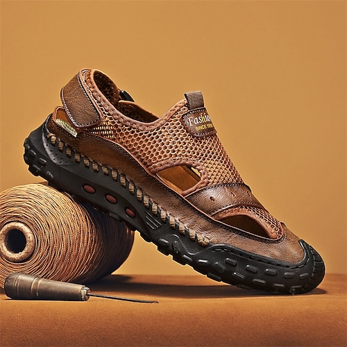 sandali da pescatore in pelle beige da uomo con design traspirante e suola comoda per abbigliamento casual, outdoor ed estivo
