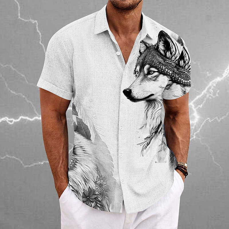 Men's Wolf Shirt Button Up Shirt Short Sleeve Vintage Casual Vacation Daily Hawaiian Summer Spring Turndown Collared Shirts Button Up 3D Print Blue Brown Gray