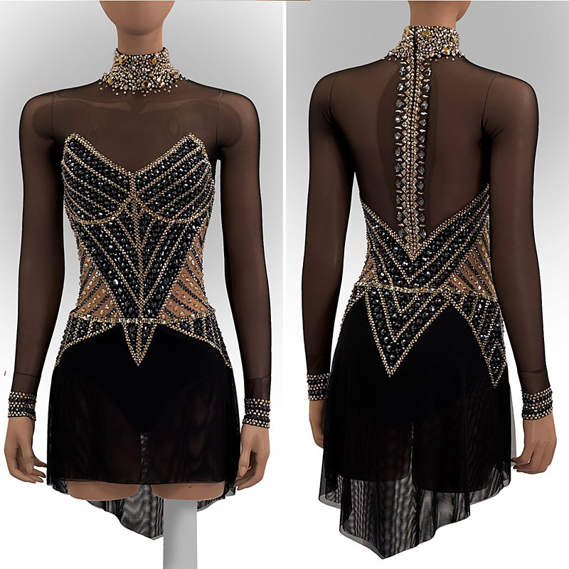 Figure Skating Dress Women's Girls' Ice Skating Dress Black Patchwork Asymmetric Hem Mesh Spandex High Elasticity Training Competition Skating Wear Classic Crystal / Rhinestone Long Sleeve Ice