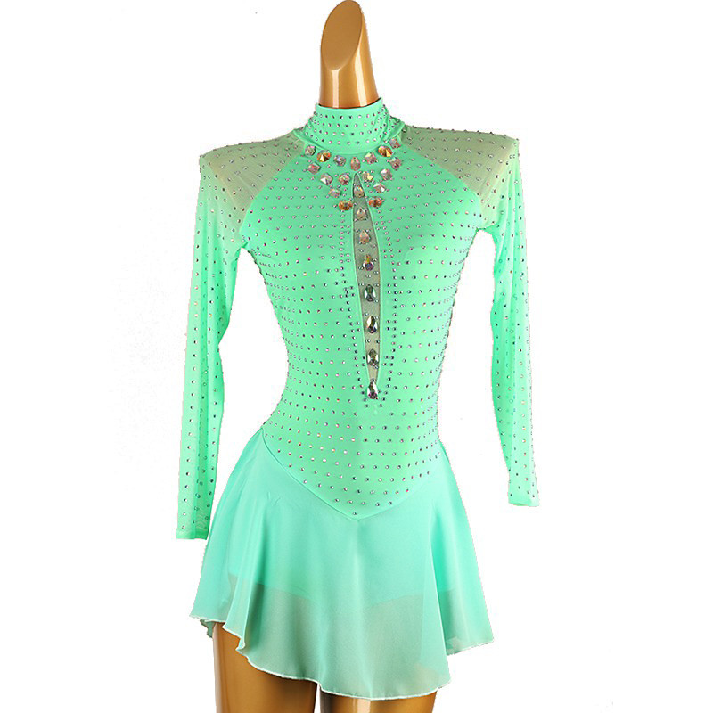 Figure Skating Dress Women's Girls' Ice Skating Dress Green Patchwork Open Back Mesh Spandex High Elasticity Training Practice Professional Skating Wear Classic Crystal / Rhinestone Long Sleeve Ice