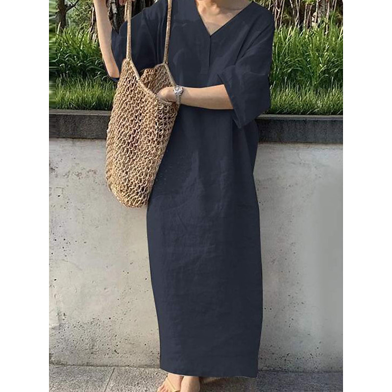Women's Maxi Dress Cotton Linen Dresses Casual Dress Basic Casual Vacation Daily Date Regular Fit Plain Short Sleeve V Neck Khaki Army Green Dark Blue Gray Summer