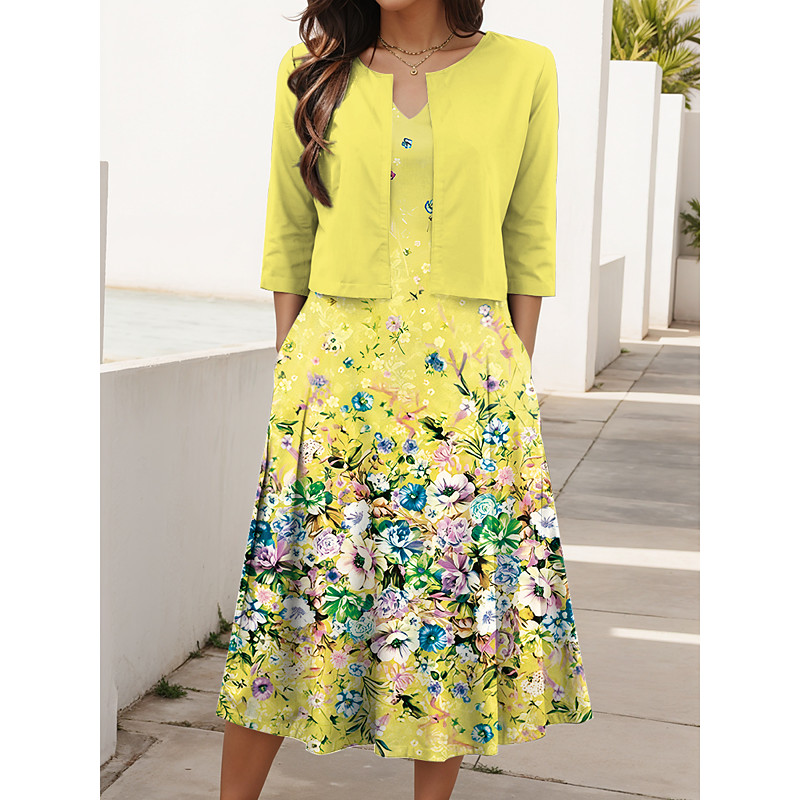 Women's Two Piece Dress Sets Midi Dress with Jacket Elegant A Line Dress Half Sleeve Casual Semi Formal Ombre Floral Print V Neck Date Yellow Pink Blue Regular Fit