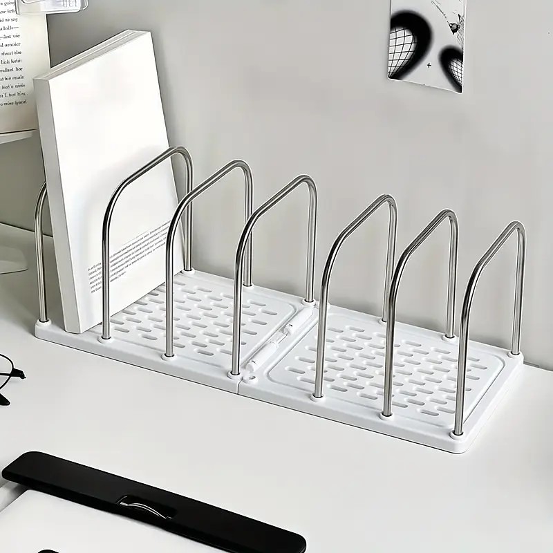 Stainless Steel and PP Desktop Bookshelf with Non-Slip Base, Adjustable Dividers Vertical Compact Bookends, Modern Minimalist Office Desk Organizer for Mail, File Storage, Student Dorm Study Shelf