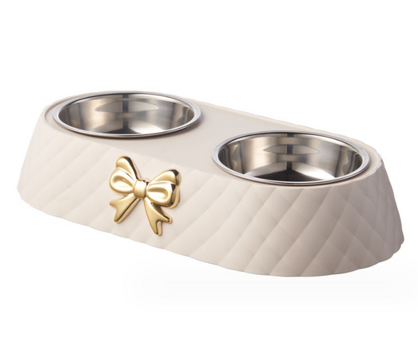 Creme quiltet dobbel hunde- og katteskål med sløyfe