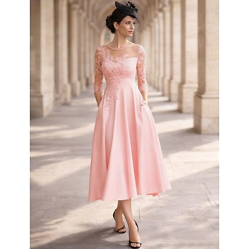 Linea ad A Lunghezza Tè Abiti da Cocktail Abiti da festa Elegante Minimalista Manica 3/4 Collo gioiello Ospite di nozze Abbigliamento da Festa Invitato a matrimonio autunnale Raso con Pieghe