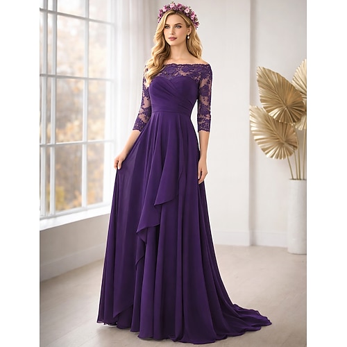 Linea ad A Lunghezza al pavimento Abito da invitata a nozze Abito Formale Abito da sera Abito da cerimonia per signora Manica 3/4 Senza Spalle Elegante Semplice Formale Ospite di nozze Serata Formale