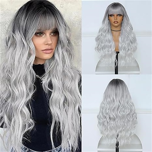 Allbell blonde Platinperücke für Frauen, langes lockiges Kunsthaar mit Pony, Wellenperücken mit dunklem Ansatz, Barbiecore-Perücken