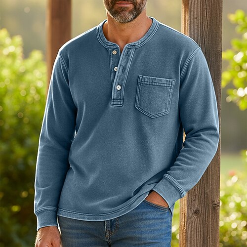 Per uomo Maglia Henley Camicia 100% cotone lavaggio acido Manica Lunga Henley Primavera Autunno Tutte le stagioni Vintage Retrò Vintage Casual Stile Vintage Lavato Casuale Blu Marrone Grigio