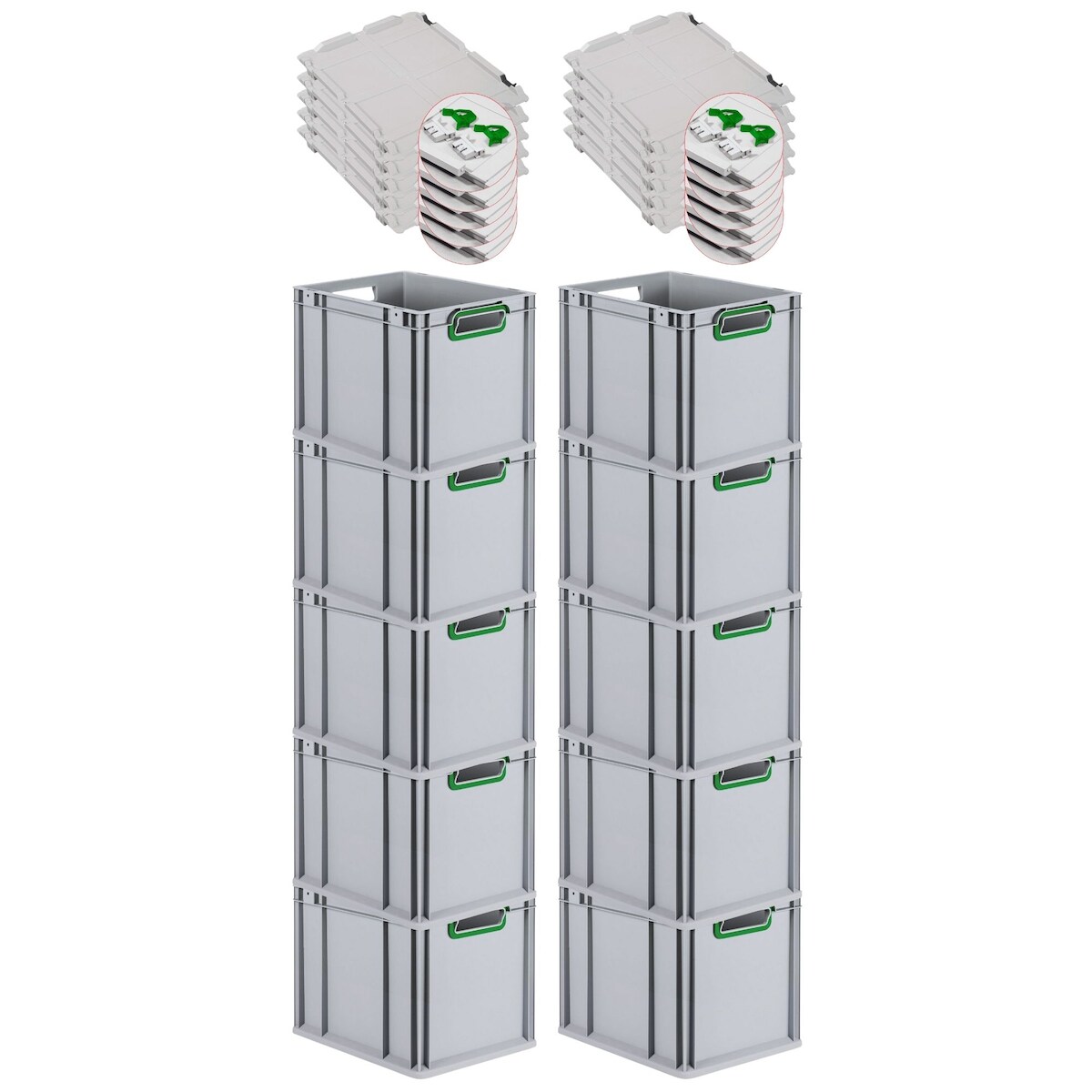 PROREGAL 10x Eurobox NextGen Color mit Scharnierdeckel & Verschlüssen | HxBxT 22x30x40cm | 30 Liter | Griffe grün offen | Glatter Boden