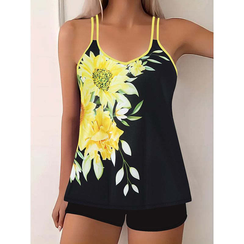 Women's Tankini 2 Piece Swimsuit Boy Leg Tummy Control High Waist Slim Backless Vacation Beach Wear Floral Geometric Scoop Neck Sleeveless Bathing Suits