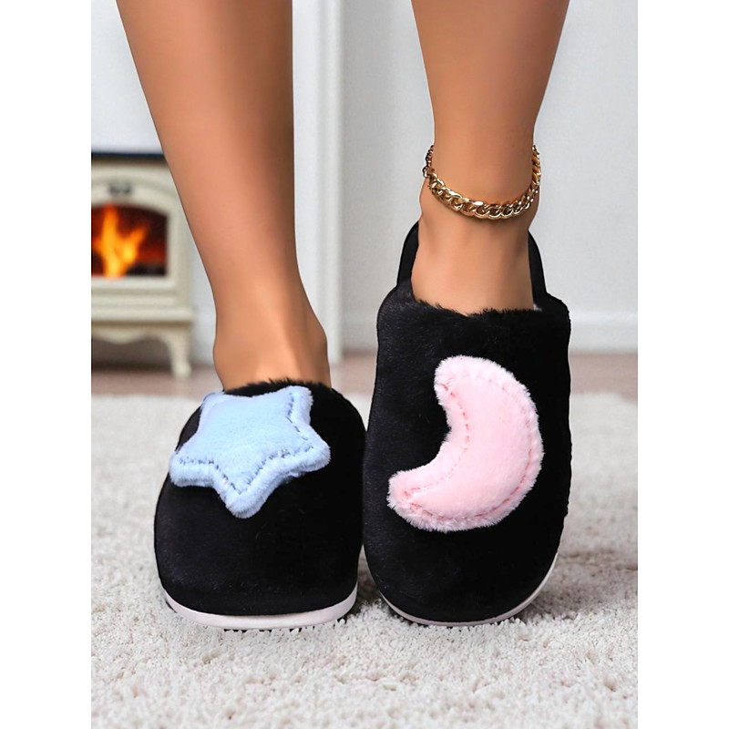 Women's White Plush Indoor Slippers with Star and MoonDecoration, Soft Warm Fleece Lining, Cute Cozy House Shoes for Winter Bedroom Home Wear